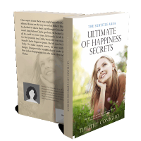 “A woman lying on grass looking up, smiling, with trees and a park in the background. Book cover with title "Ultimate Secrets of Happiness."”
