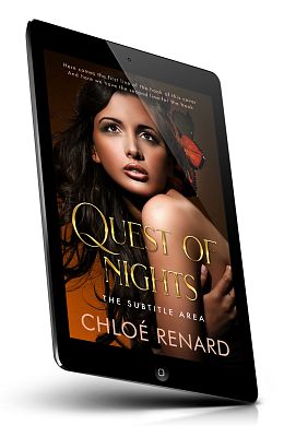“A woman with long dark hair and a butterfly in her hair gazes upward on a book cover titled "Quest of Nights" by Chloé Renard.”