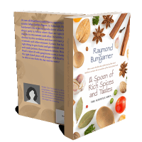 “An assortment of spices, herbs, and wooden spoons arranged around the cover of a book.”