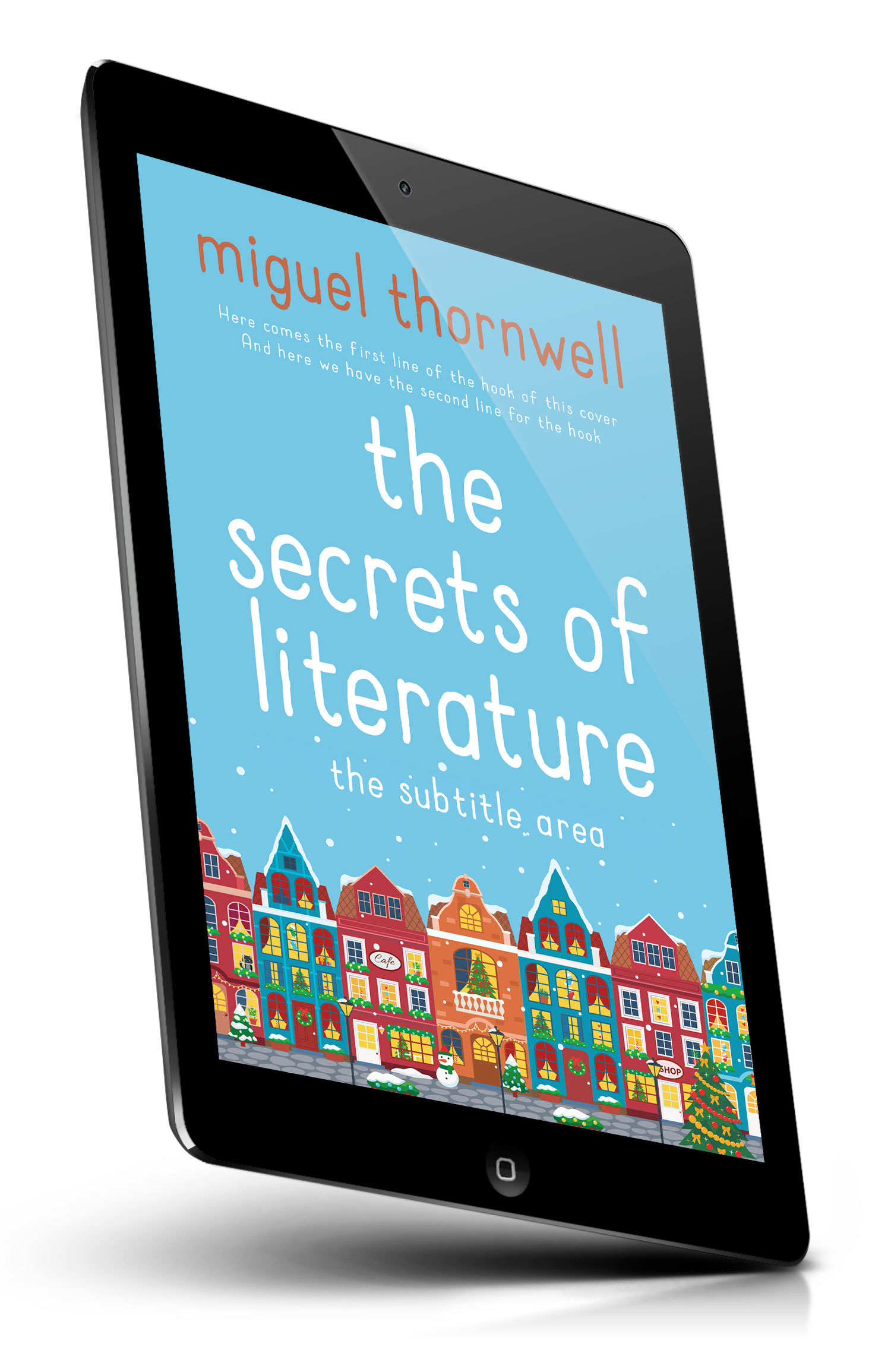 Tags: winter, snowfall, snowy village, festive, holiday, christmas, christmas tree, decorated houses, quaint town, colorful buildings, rowhouses, street scene, snowman, cozy, whimsical, illustration, playful typography, blue background, night sky, book cover, premade cover, book cover design, self-publishing, ebook cover, print ready