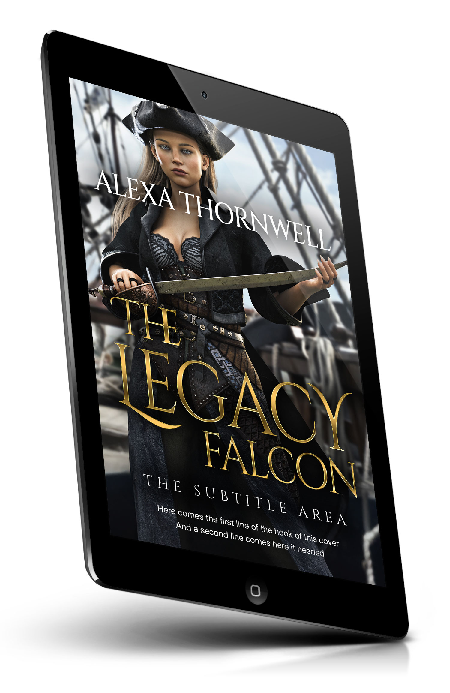 “A pirate woman in a tricorn hat holds a sword on a ship deck, with rigging and sails blurred in the background.”