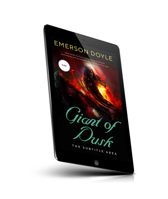 “A dark, ominous figure shrouded in a fiery, chaotic background, with the text "Giant of Dusk" in elegant font at the bottom.”