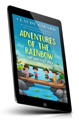 “Four children stand by a river with rocks and greenery, below a bright, colorful sky.”