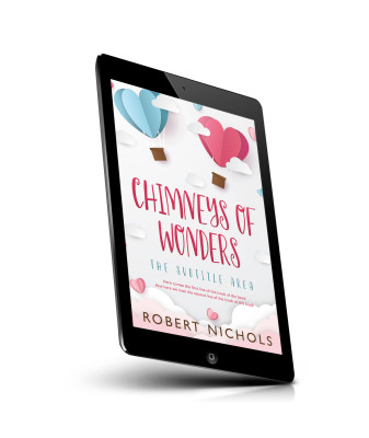 “Hot air balloons shaped like hearts float among clouds on a light background.”