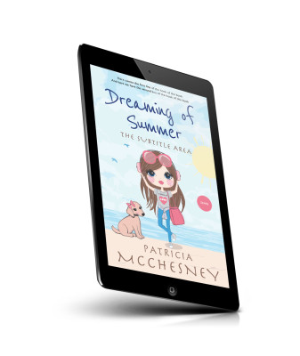 “A cute illustration of a girl with sunglasses, a bag, and a heart t-shirt standing on a beach with a dog. Sky, sun, and clouds in the background.”