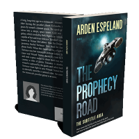 “A spaceship with bright lights flies through a stormy sky. The title "The Prophecy Road" is prominent in large blue letters.”