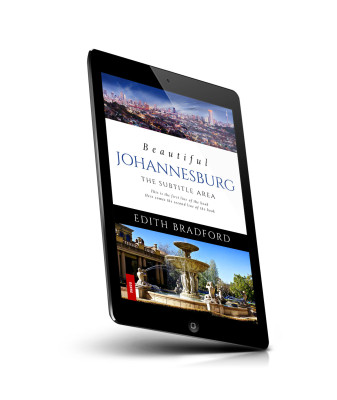 “A book cover featuring Johannesburg's cityscape at dusk above and a grand fountain in front of an elegant building below.”