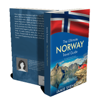 “A travel guide cover featuring a Norwegian flag, a picturesque landscape with mountains, water, and a red cabin.”