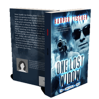 “A person in sunglasses points a gun directly at the camera, with the book title "One Lost Widow" prominently displayed below.”