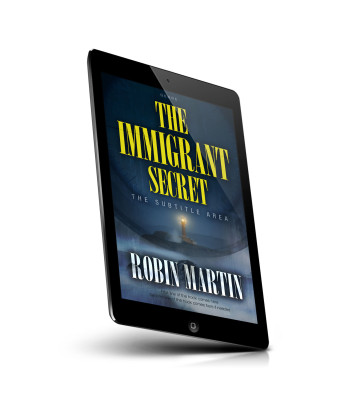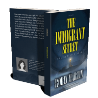 “A lighthouse standing on a rocky coast under a stormy sky with the title "The Immigrant Secret" and the name "Robin Martin" prominently displayed.”