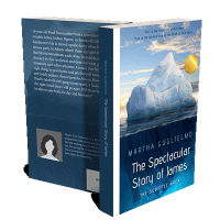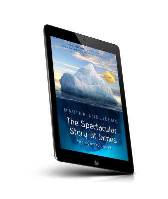“An iceberg floats in the ocean with a sunset background; the image features the title "The Spectacular Story of James."”