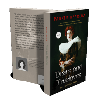 “A woman with pale skin and red hair wearing an elaborate ruffled collar and historical attire, set against a dark background.”