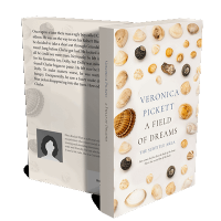 “Seashells of various shapes and colors are scattered across a light background, with text about a book titled "A Field of Dreams" by Veronica Pickett.”