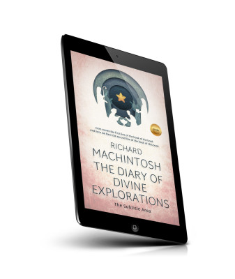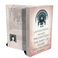 “A book cover with silhouettes, a star in the center, and a golden seal on a textured background. The title is "The Diary of Divine Explorations."”