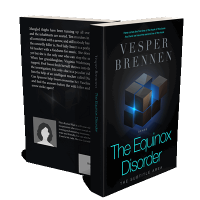 “A futuristic book cover with a glowing cube design, featuring "The Equinox Disorder" in bright blue text.”