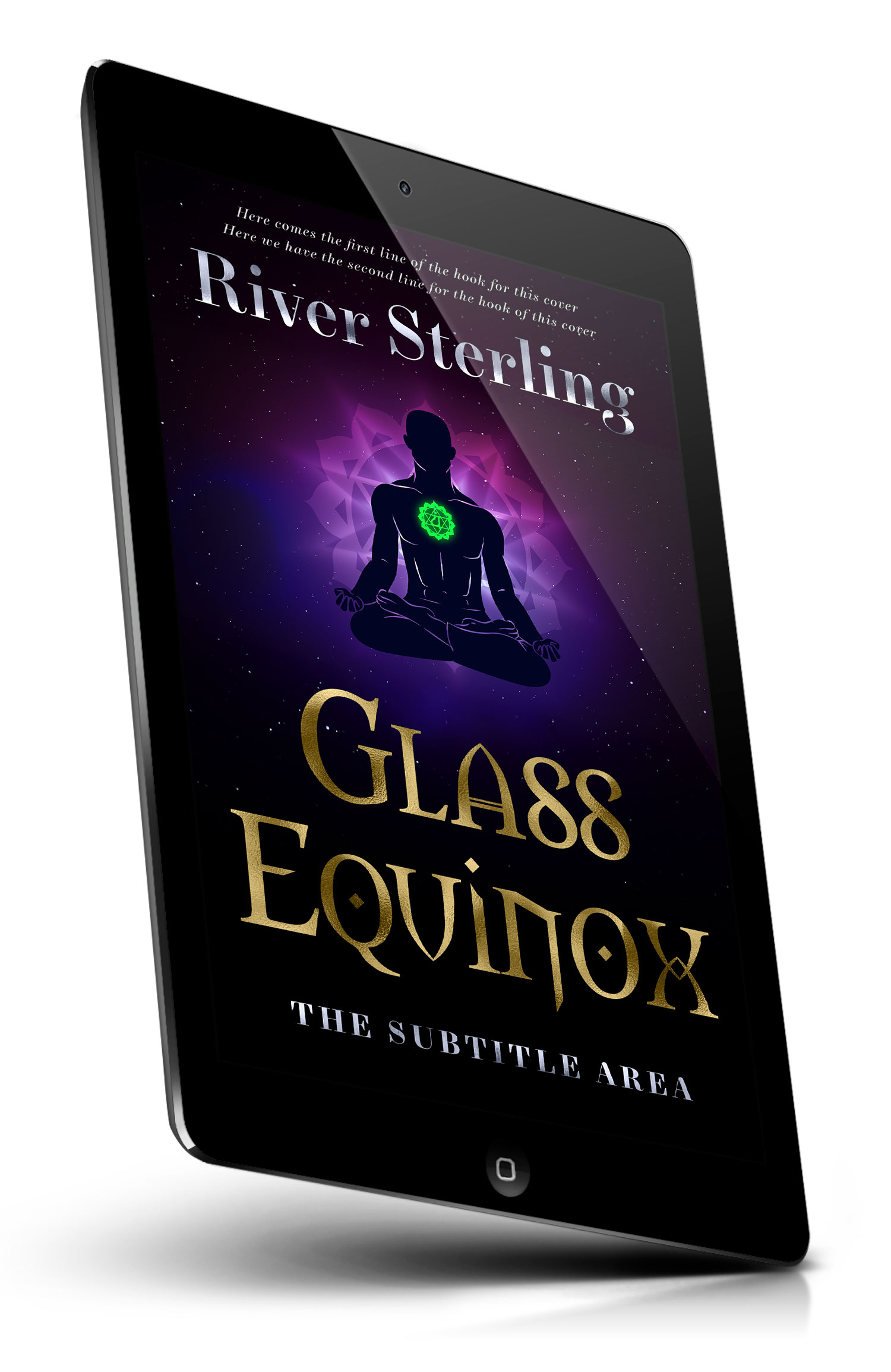 “Silhouette meditating in lotus pose with a glowing green heart symbol, set against a purple starry cosmic background.”