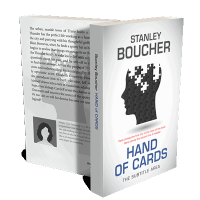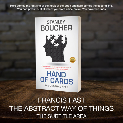 “A book cover with a silhouette head filled with puzzle pieces and a genre seal. The title reads "Hand of Cards" with an area for a subtitle.”