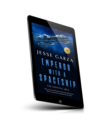 “A spaceship floats in space with a background of stars. The design has a sci-fi feel with a predominant blue color theme.”