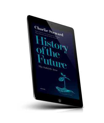 “A dark-themed book cover with a glowing hand holding a small plant. The title is "History of the Future" with a subtitle below.”