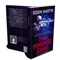 “A futuristic soldier aiming with a high-tech weapon. Title of the book in bold red letters with author's name at the top.”