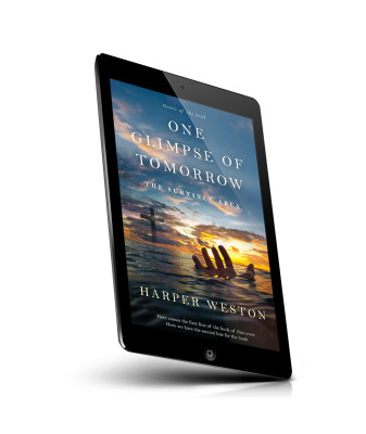 “A hand reaches out from the water at sunset with a cross in the background, under dramatic clouds and an orange-pink sky.”