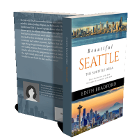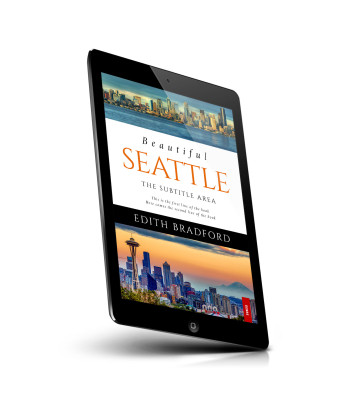 “A vibrant book cover featuring Seattle’s skyline, with the Space Needle and Mount Rainier visible, showcasing day and evening scenes.”