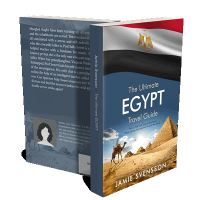 “A travel guide cover featuring the Egyptian flag, pyramids, and a person on a camel in the desert.”
