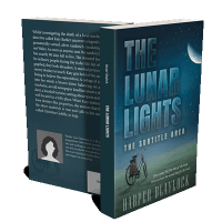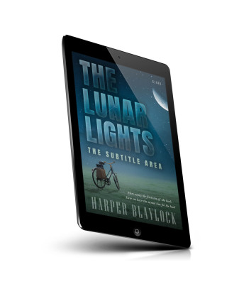 “A book cover features a night sky with a crescent moon, a bicycle with a basket, and a grassy field. The title reads "THE LUNAR LIGHTS."”