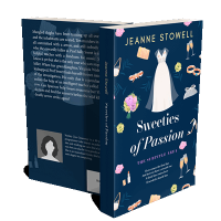 “A book cover with a bridal dress, flowers, champagne glasses, rings, and gifts on a navy blue background.”