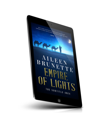“Silhouettes of camels and a person against a blue, starry night sky with a crescent moon. White and gold text below.”