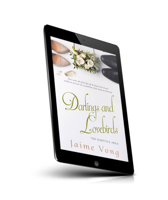 “A book cover featuring shoes, rings, a floral arrangement, and the title "Darlings and Lovebirds" by Jaime Vong.”