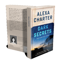 “A car by a field at sunset, with a dramatic title emphasizing "Dark Secrets" in bold blue text.”