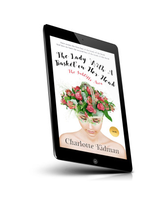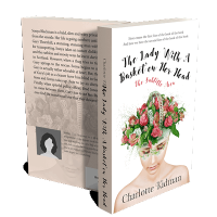 “A woman's head with a basket of flowers on top, set against a white background. The image has a whimsical and creative design.”