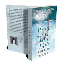 “A girl sits on a whale under a moonlit sky, surrounded by water and distant boats.”