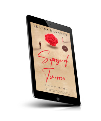“Two small illustrated figures stand apart on a beige background, with a large red rose above them.”