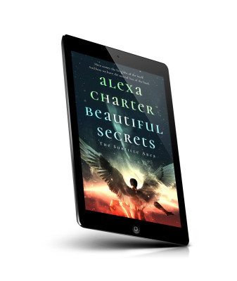 “A figure with wings stands against a cosmic background, light emanating from the ground.”