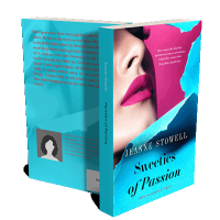 “A close-up of a woman with bright pink lipstick against a vivid blue and pink torn background. Title "Sweeties of Passion" is prominent.”