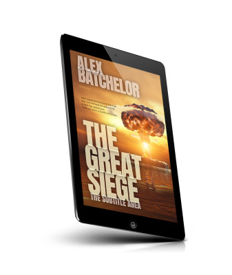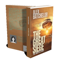 “A large explosion creates a mushroom cloud over water, illuminated by a dramatic golden sky. Text overlaying it refers to a book by Alex Batchelor.”