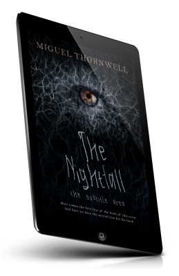 “A dark, mysterious eye peers through a web-like texture on a black background with "The Nightfall" written below.”