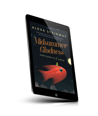 “A small figure sits on a large, glowing red fish swimming in a dark, starry sky.”