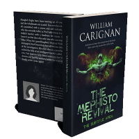 “A muscled figure emerges with green smoke and wings on a dark background, genre label attached.”