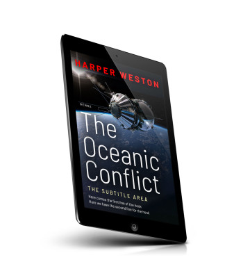 “A futuristic spacecraft orbits above Earth, set against a dark space backdrop. The cover title is "The Oceanic Conflict."”