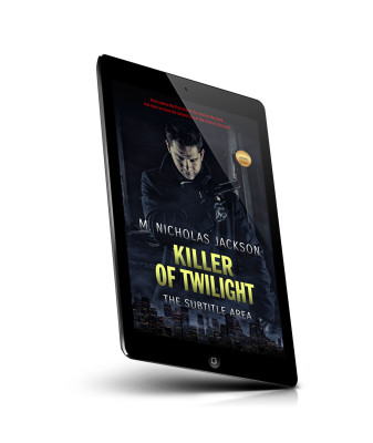 “A man in a dark coat holds a gun in a dim, urban setting. City skyline visible below. Book cover with suspenseful theme.”