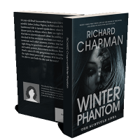 “A grayscale book cover featuring a woman's face partially obscured by hair, with the title "Winter Phantom" and author's name "Richard Chapman."”
