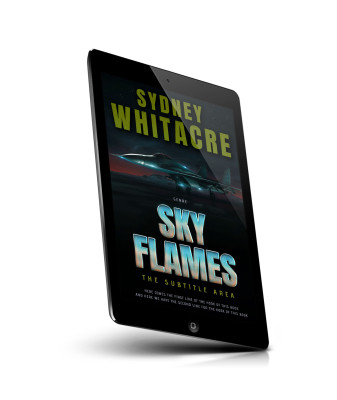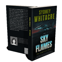 “A jet fighter soars in a dark, cloudy sky, illuminated by distant lighting. The cover is dominated by the title "Sky Flames."”