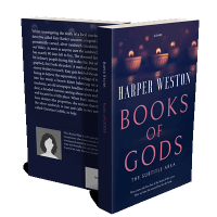“Candles float above a dark background with the title "Books of Gods" in large, bold letters.”