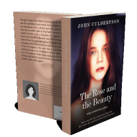 “A close-up of a woman with long dark hair, overlaid with book title and author name.”