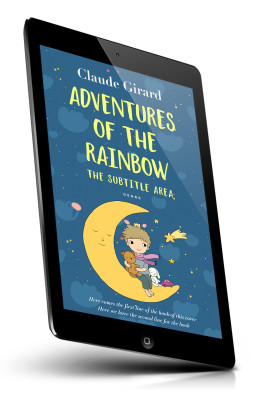 “A child sits on a crescent moon with animal friends under a starry sky. The background is blue with stars.”