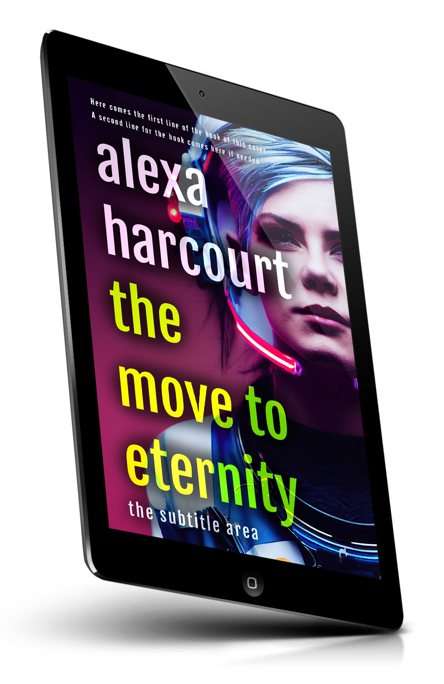 Tags: sci-fi, futuristic, neon lights, cyber theme, technology, cover art, digital interface, vibrant colors, portrait, glowing, headset, typography, modern design, rainbow hues, female protagonist, bold font, speculative fiction, sleek style, imaginative, storytelling