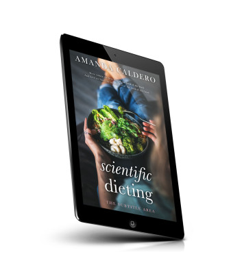 “A person holding a bowl of salad while sitting with crossed legs, with book title "Scientific Dieting" in large text at the bottom.”